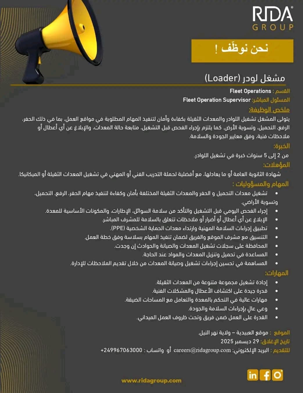 مجموعة رضا تعلن عن فرصة عمل لمشغل لودر بولاية نهر النيل