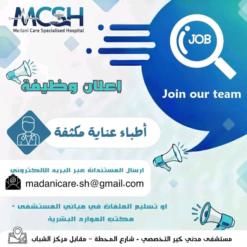 طريقة التقديم: يتم تسليم الملفات مباشرة بمباني المستشفى – مكتب الموارد البشرية، أو إرسال السيرة الذاتية والمستندات عبر البريد الإلكتروني: madanicare.sh@gmail.com، آخر يوم لاستلام الطلبات: الخميس 18 / 12 / 2025.