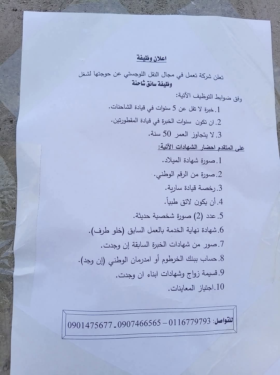 على المتقدم إحضار المستندات التالية: صورة من شهادة الميلاد، صورة من الرقم الوطني، رخصة قيادة سارية المفعول، عدد (2) صورة شخصية حديثة، شهادة نهاية الخدمة من العمل السابق (خلو طرف)، صور من شهادات الخبرة السابقة إن وجدت، حساب ببنك الخرطوم أو بنك أم درمان الوطني إن وجد، إضافة إلى قسيمة الزواج وشهادات الأبناء إن وُجدت.