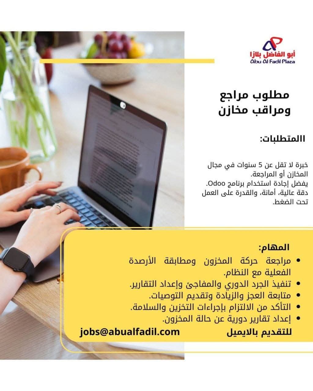 تسعى شركة أبو الفاضل إلى تعيين مراجع ومراقب مخازن يكون مسؤولًا عن متابعة حركة المخزون اليومية، وضمان مطابقة الأرصدة الفعلية مع البيانات المسجلة في النظام، بما يسهم في تعزيز الانضباط المالي والإداري داخل الشركة.