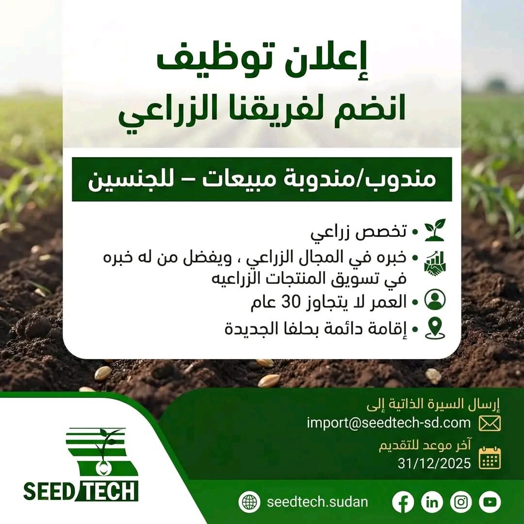 تفاصيل التقديم: على الراغبين في التقديم إرسال السيرة الذاتية عبر البريد الإلكتروني import@seedtech-sd.com، مع ضرورة كتابة المسمى الوظيفي (مندوب مبيعات – حلفا الجديدة) في عنوان البريد الإلكتروني، على أن يكون آخر موعد للتقديم هو 31/12/2025.