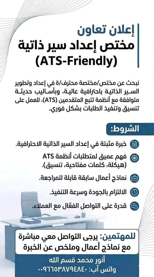 إعلان تعاون لمختصين في إعداد السير الذاتية الاحترافية (ATS-Friendly)