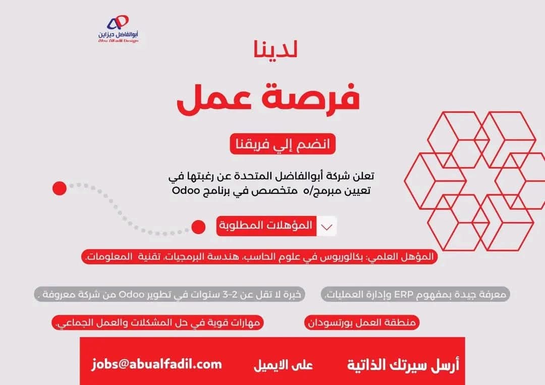 في وقت تتسارع فيه وتيرة التحول الرقمي داخل المؤسسات السودانية، تواصل بعض الشركات الاستثمار في الكفاءات التقنية القادرة على تطوير أنظمتها وتحسين كفاءة أعمالها. وفي هذا الإطار، أعلنت شركة أبو الفاضل المتحدة عن توفر فرصة عمل لمبرمج أو مبرمجة متخصصين في نظام Odoo، للانضمام إلى فريقها التقني والمساهمة في تطوير حلول رقمية تدعم إدارة العمليات المؤسسية.