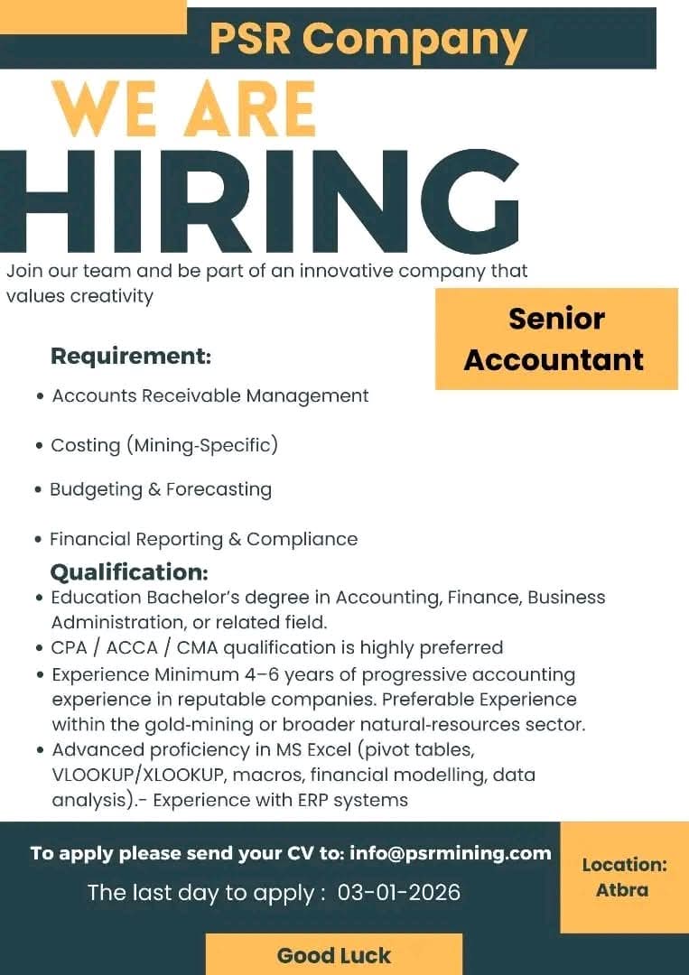 تفاصيل التقديم: على الراغبين في التقديم لوظيفة محاسب أول بشركة PSR إرسال السيرة الذاتية عبر البريد الإلكتروني info@psrmining.com، علمًا بأن آخر موعد للتقديم هو 03 يناير 2026، ويقع مقر العمل في مدينة عطبرة.