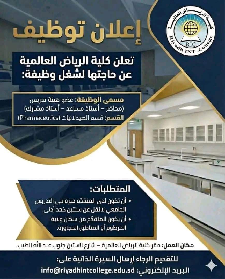 مكان العمل: مقر كلية الرياض العالمية – شارع الستين جنوب عبد الله الطيب. طريقة التقديم: يُرجى إرسال السيرة الذاتية عبر البريد الإلكتروني info@riyadhintcollege.edu.sd