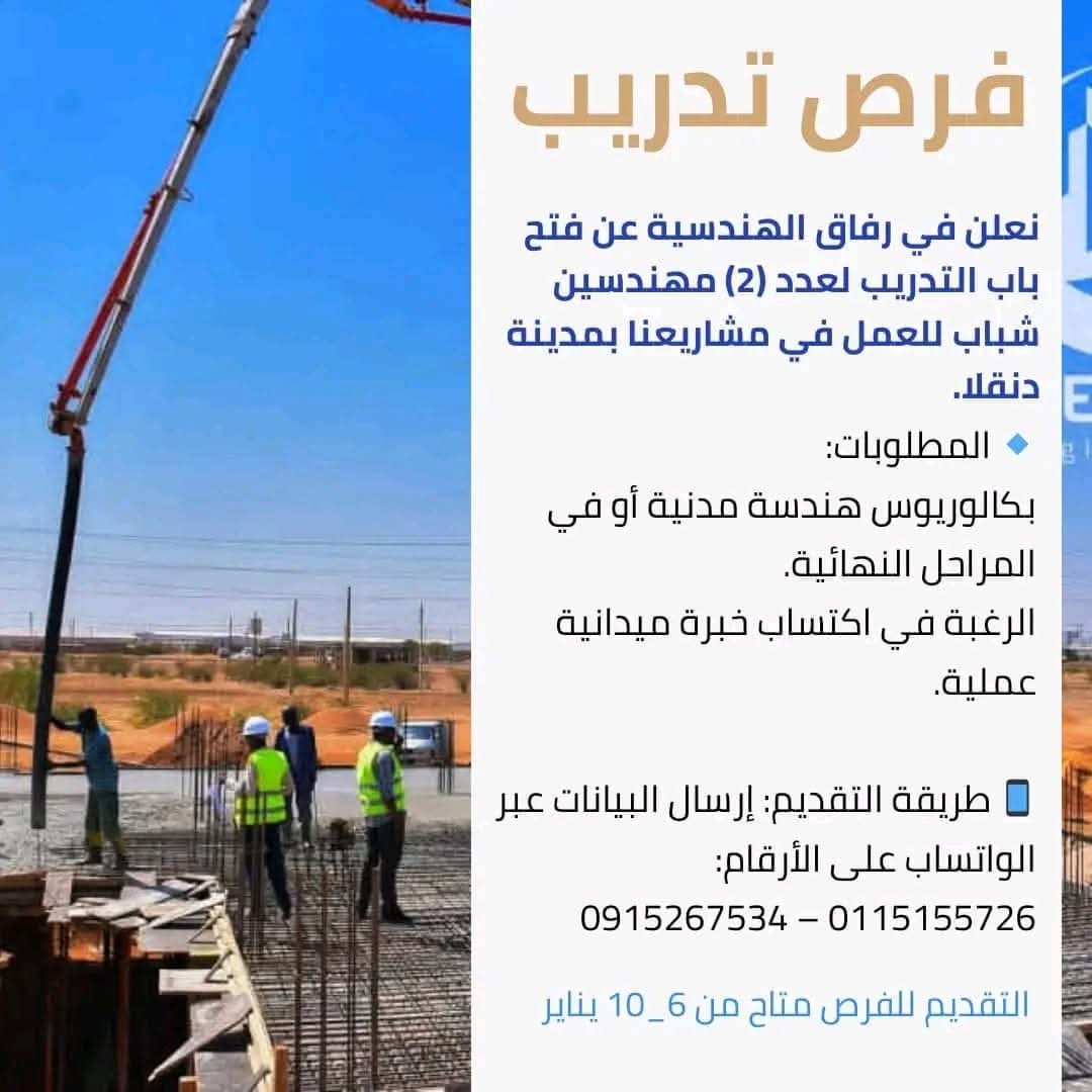 تعلن شركة رفاق الهندسية عن فتح باب التدريب لعدد (2) مهندسين شباب للانضمام إلى مشاريعها في مدينة دنقلا، في فرصة تهدف إلى تمكين الشباب من اكتساب الخبرة العملية الميدانية ضمن بيئة عمل احترافية.