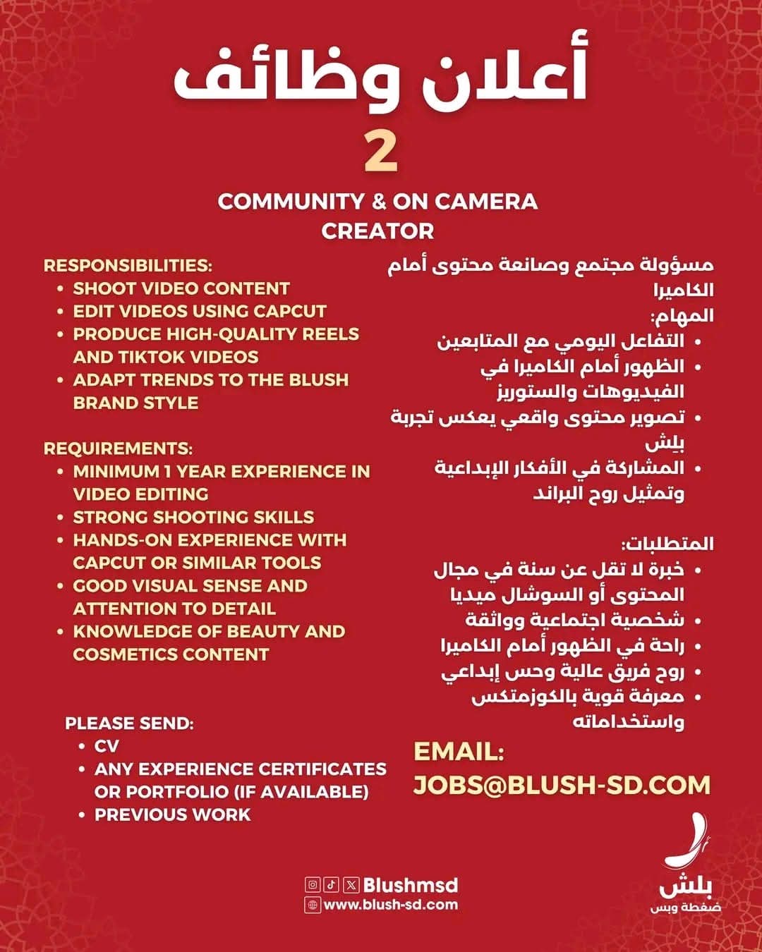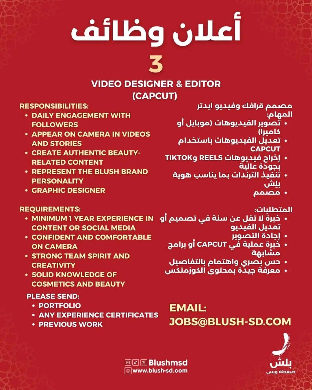 تبحث الشركة عن مرشحات ومرشحين لديهم خبرة لا تقل عن سنة في نفس المجال، وشغف حقيقي بعالم الكوزمتكس والجمال، وقادرين على العمل ضمن فريق إبداعي. بالنسبة للوظيفة الثالثة (مصمم جرافيك وفيديوهات)، التقديم مفتوح للذكور والإناث، بينما الوظائف الأخرى مخصصة للإناث فقط. ويشترط كتابة اسم الوظيفة في عنوان الإيميل (Subject) عند التقديم.
