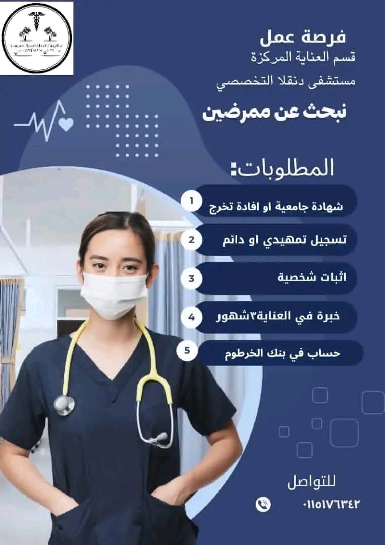 تعلن مستشفى دنقلا عن حاجتها لتوظيف ممرضين للعمل في قسم العناية المكثفة، في خطوة لتعزيز الكادر الطبي وتقديم خدمات رعاية عالية الجودة للمرضى.