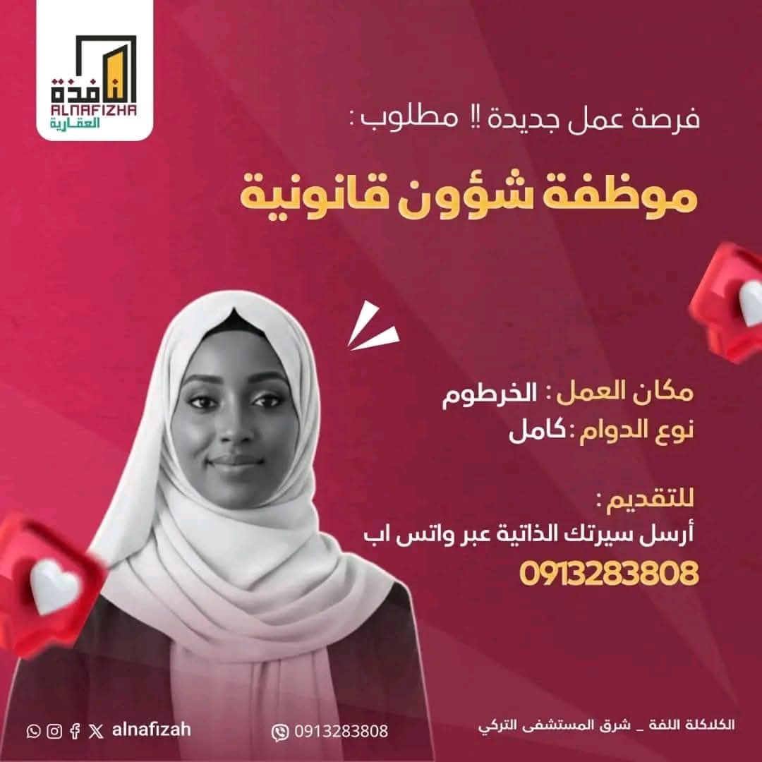 تعلن شركة النافذة العقارية عن فرصة عمل جديدة تستهدف استقطاب الكفاءات في مجال الشؤون القانونية بمدينة الخرطوم، حيث تسعى الشركة إلى تعزيز فريقها بكادر مهني قادر على متابعة الجوانب القانونية اليومية، وضمان سير العمليات وفق اللوائح والأنظمة، إضافة إلى تقديم المشورة القانونية ومتابعة المستندات والعقود بما يضمن حماية مصالح الشركة وتسهيل مهام الأقسام المختلفة.