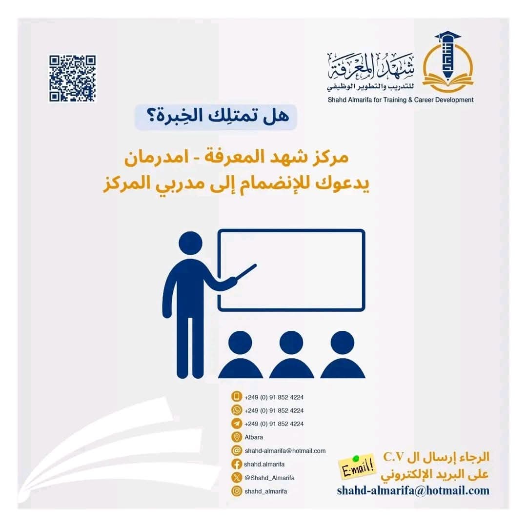 في ظل استعداد مركز شهد المعرفة لفتح أبوابه في أم درمان، يعلن المركز عن رغبته في استقطاب مدربين مختصين يتمتعون بخبرة حقيقية ورغبة صادقة في التأثير الإيجابي. يؤمن المركز بأن التدريب ليس مجرد تقديم محتوى، بل هو مسؤولية تتطلب فهمًا عميقًا لاحتياجات المتدربين وقدرة على إيصال المعرفة بأسلوب إنساني ومهني يعزز من بناء القدرات ويحقق أثرًا ملموسًا في سوق العمل السوداني.