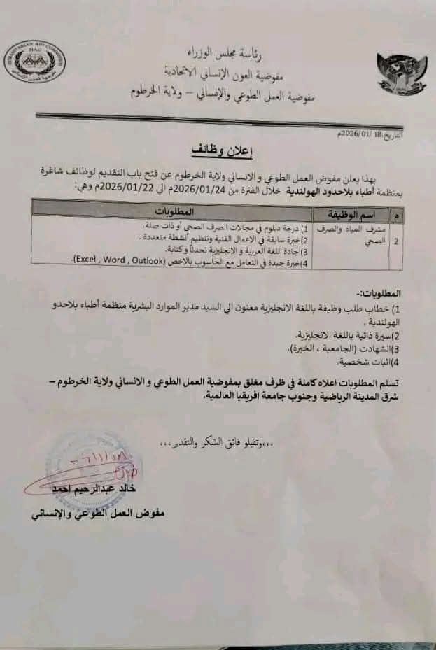 تعلن منظمة أطباء بلا حدود الهولندية عن فتح باب التقديم لوظيفة مشرف المياه والصرف الصحي، ضمن فريق يسعى لتطوير مشاريع المياه والصرف الصحي ودعم المجتمعات المحلية في السودان.