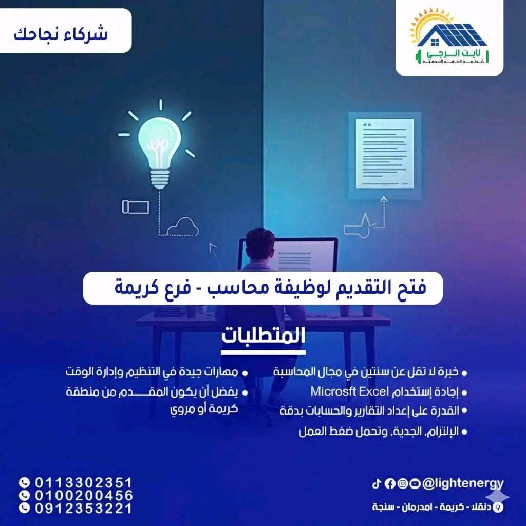 شركة Light Energy تعلن عن وظيفة محاسب بفرع كريمة