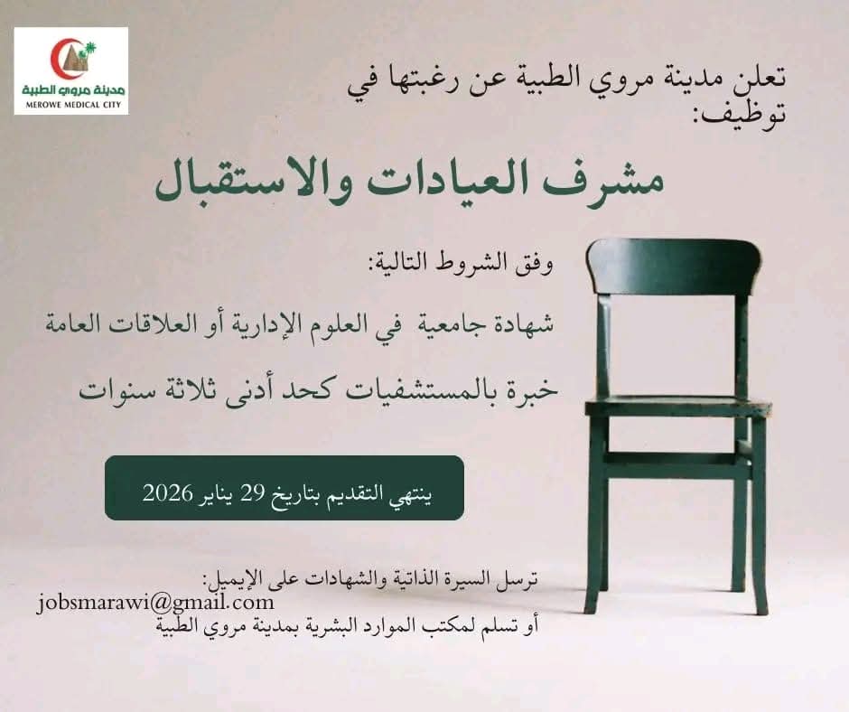 طريقة التقديم: يُمكن إرسال السيرة الذاتية والشهادات على البريد الإلكتروني jobsmarawi@gmail.com أو تسليمها مباشرة لمكتب الموارد البشرية بمدينة مروي الطبية. آخر موعد للتقديم هو 29 يناير 2026.