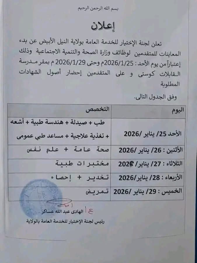 مكان المعاينات: مقر مدرسة القابلات كوستي.الجهة: لجنة الإختيار للخدمة العامة بولاية النيل الأبيض.التوقيع: ع/ الهادي عبد الله عساكر رئيس لجنة الإختيار للخدمة العامة بالولاية.مطلوب إحضار أصول الشهادات المطلوبة وفق الجدول أعلاه.