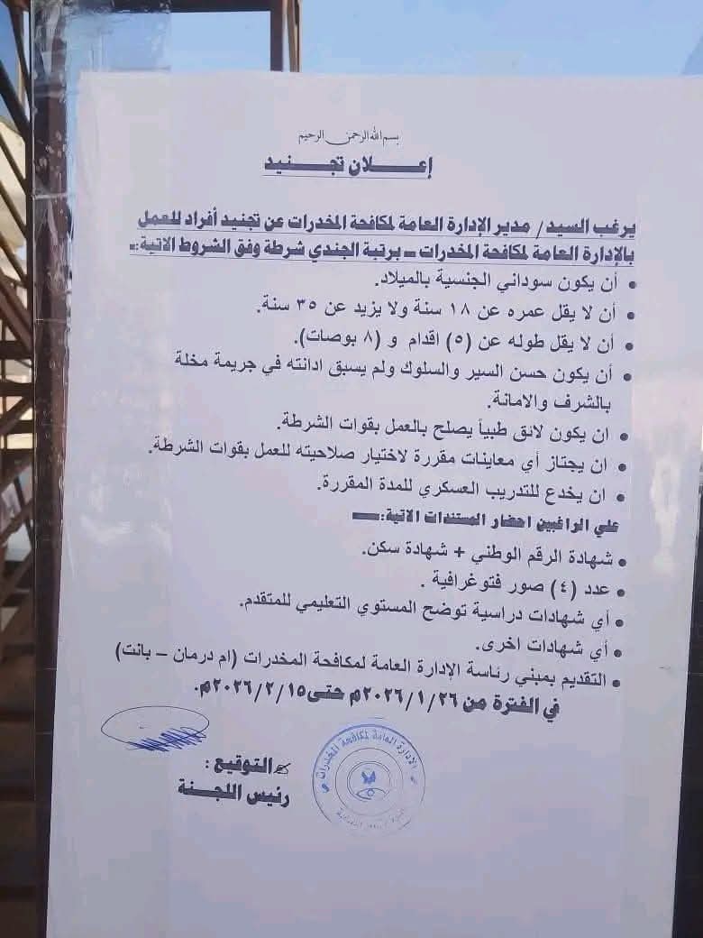 الإدارة العامة لمكافحة المخدرات تدعو الشباب للتقديم وفق شروط محددة خلال الفترة من 26 يناير وحتى 15 فبراير 2026 بأم درمان