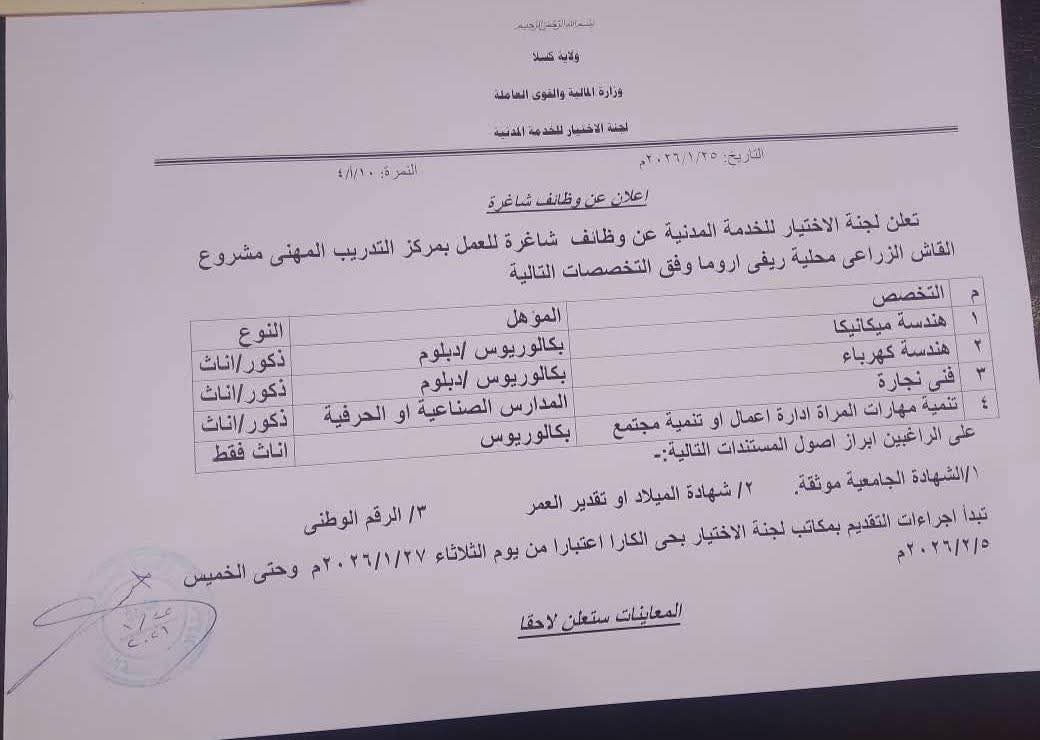 في إطار سعيها لتعزيز الكوادر الفنية والمهنية ودعم مشروعات التنمية المحلية، أعلنت لجنة الاختيار للخدمة المدنية بولاية كسلا عن فتح باب التقديم لوظائف شاغرة للعمل بمركز التدريب المهني، ضمن مشروع القاش الزراعي بمحلية ريفي أروما، في خطوة تهدف إلى رفع كفاءة التدريب وبناء القدرات بما يخدم المجتمع المحلي ويسهم في تحقيق التنمية المستدامة.