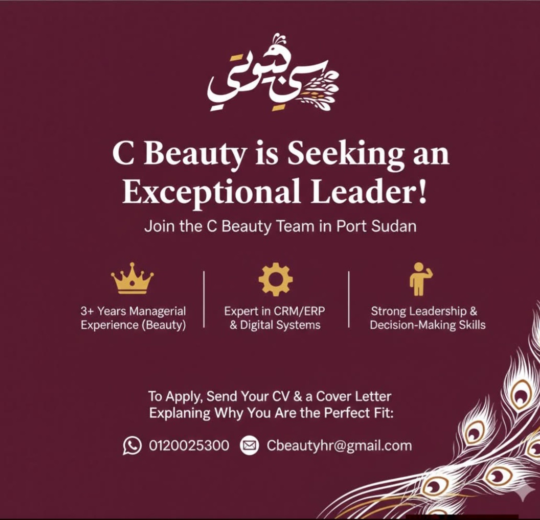 في إطار سعيها لتعزيز حضورها المؤسسي ودعم القيادات النسائية في المناصب الإدارية العليا، أعلنت شركة C Beauty UAE عن توفر فرصة وظيفية قيادية بفرعها في مدينة بورتسودان، وذلك لشغل منصب مدير العمليات، ضمن خططها لتطوير الأداء التشغيلي وتحقيق نمو مستدام في قطاع الكوزمتكس والتجميل.