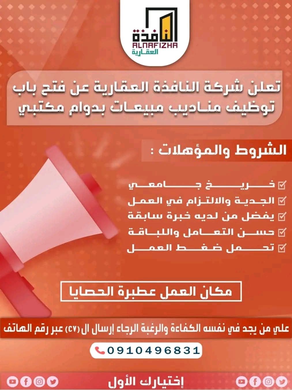 فرصة للخريجين للانضمام إلى فريق المبيعات بمنطقة الحصايا مع اشتراط الجدية واللباقة وتحمل ضغط العمل والتقديم عبر الهاتف مباشرة