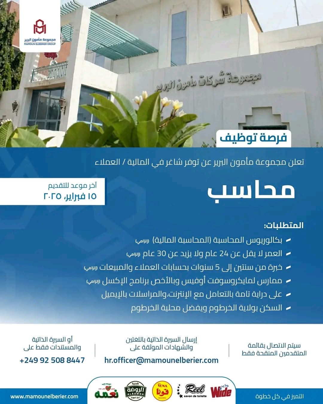 يتم إرسال السيرة الذاتية باللغتين العربية والإنجليزية مرفقة بالشهادات الأكاديمية الموثقة من التعليم العالي وشهادات الخبرة عبر البريد الإلكتروني hr.officer@mamounelberier.com أو عبر رقم الواتساب +249925088447 (السيرة الذاتية والمستندات فقط).
