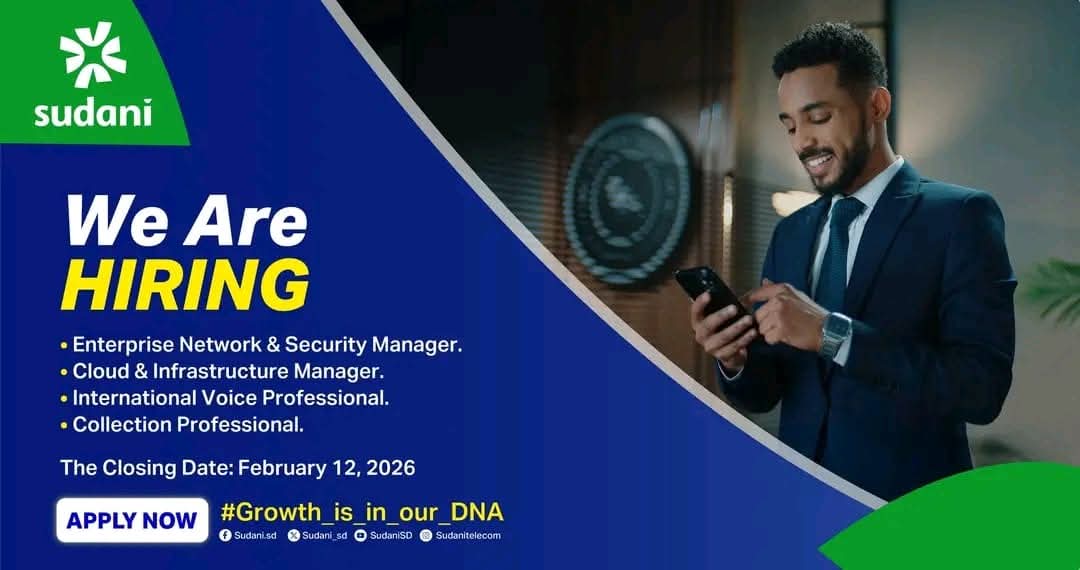 📌 الجهة: شركة سوداني للاتصالات | الوظائف المتاحة: Enterprise Network & Security Manager – Cloud & Infrastructure Manager – International Voice Professional – Collection Professional | 🗓 آخر يوم للتقديم: 12 فبراير 2026 | 🔗 رابط التقديم: https://sudani.sd/careers/