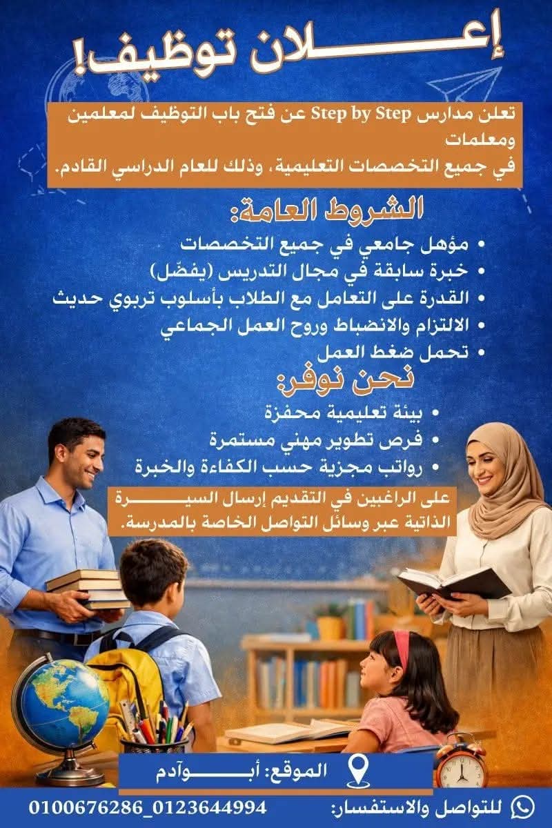 في ظل تزايد الاهتمام بتطوير العملية التعليمية وبناء بيئة دراسية حديثة تستجيب لاحتياجات الطلاب، أعلنت مدارس Step by Step عن فتح باب التقديم لعدد من الوظائف التعليمية، مستهدفة المعلمين والمعلمات من مختلف التخصصات الراغبين في الانضمام إلى مؤسسة تسعى لصناعة أثر حقيقي داخل الفصول الدراسية. ويأتي هذا الإعلان في وقت يبحث فيه الكثير من الكوادر التربوية عن فرص عمل مستقرة توفر لهم بيئة محفزة ومساحة للنمو المهني.