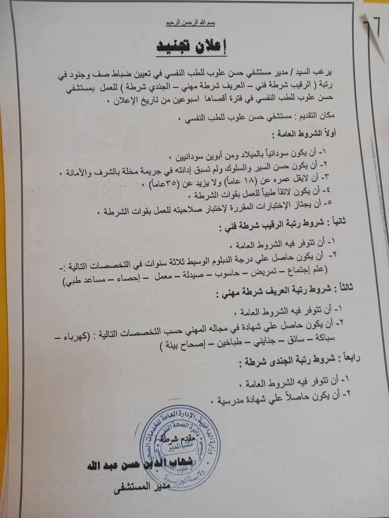 مستشفى حسن علوب للطب النفسي يعلن عن وظائف لضباط صف وجنود من الشرطة السودانية