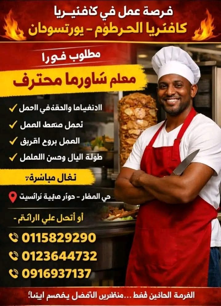 أعلنت كافتريا واحة الخرطوم في بورتسودان عن فرصة عمل عاجلة لشغل وظيفة معلم شاورما محترف، ضمن فريق العمل بالكافتريا، في إطار سعي الإدارة لتعزيز جودة الخدمات وتقديم تجربة متميزة للزبائن.