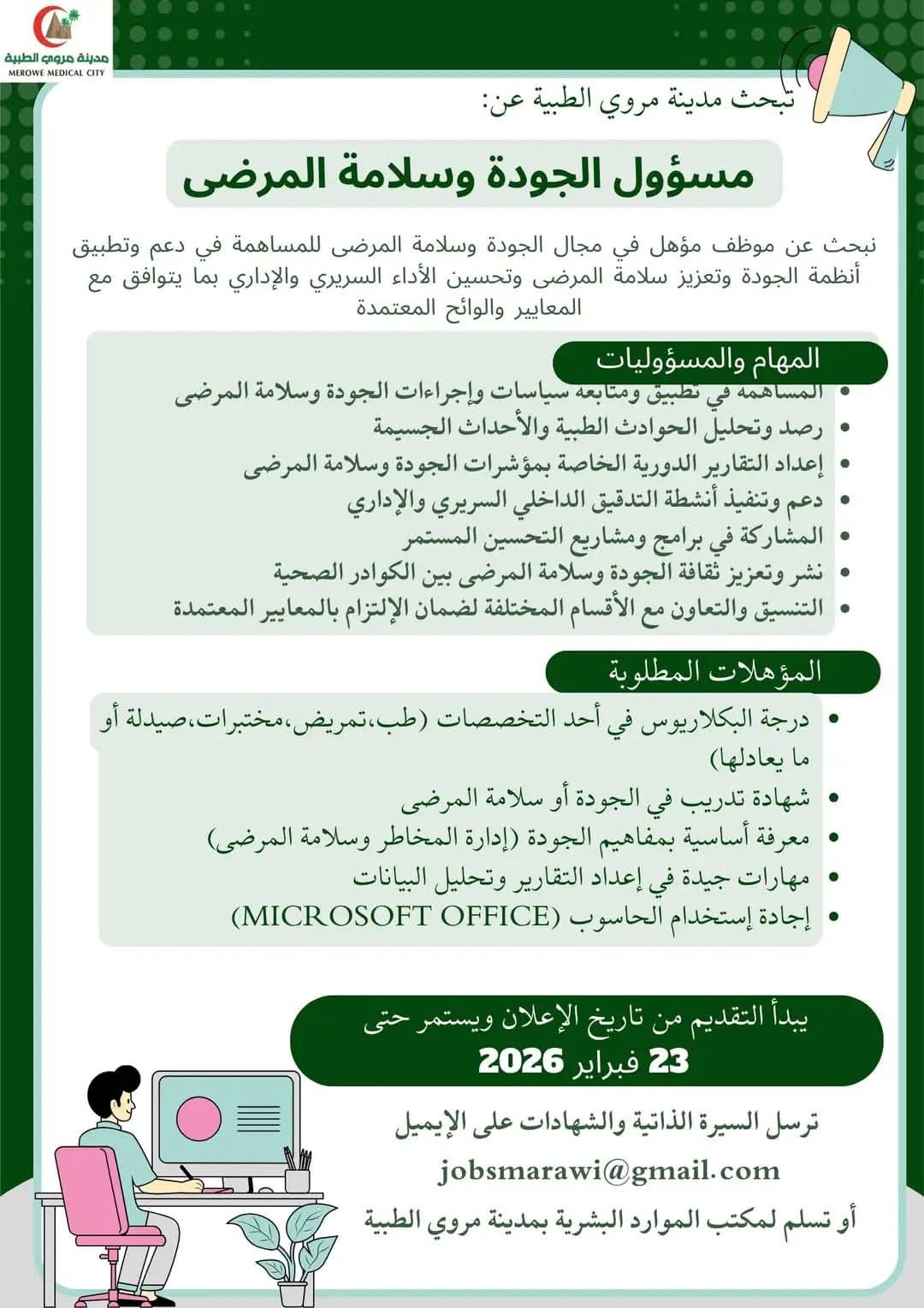 إعلان توظيف لدى مدينة مروي الطبية – مسؤول الجودة وسلامة المرضى