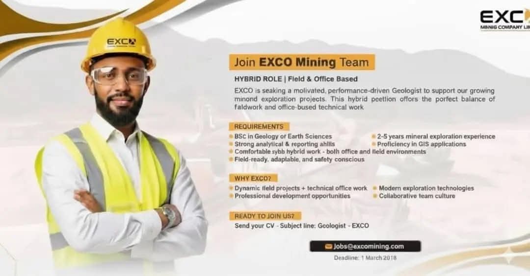 شركة EXCO للتعدين تعلن عن وظيفة جيولوجي (Geologist) بنظام عمل هجين
