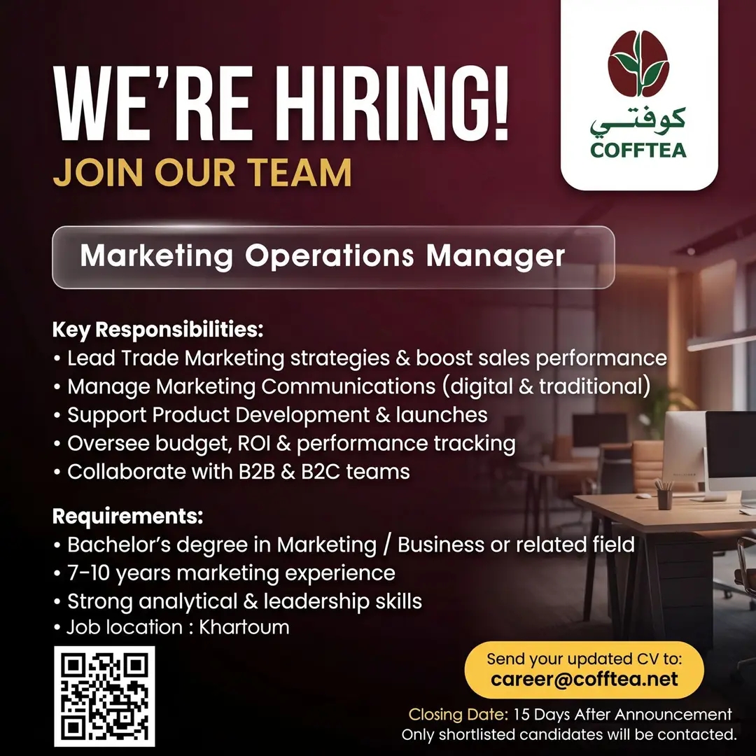 في خطوة تعكس توجهها نحو تعزيز حضورها في السوق وتوسيع نطاق علامتها التجارية، أعلنت شركة كوفتي التجارية المحدودة عن فتح باب التقديم لشغل وظيفة Marketing Operations Manager للعمل من مقرها في الخرطوم، مستهدفة استقطاب كفاءات قيادية تمتلك الرؤية الاستراتيجية والخبرة العملية في إدارة العمليات التسويقية.
