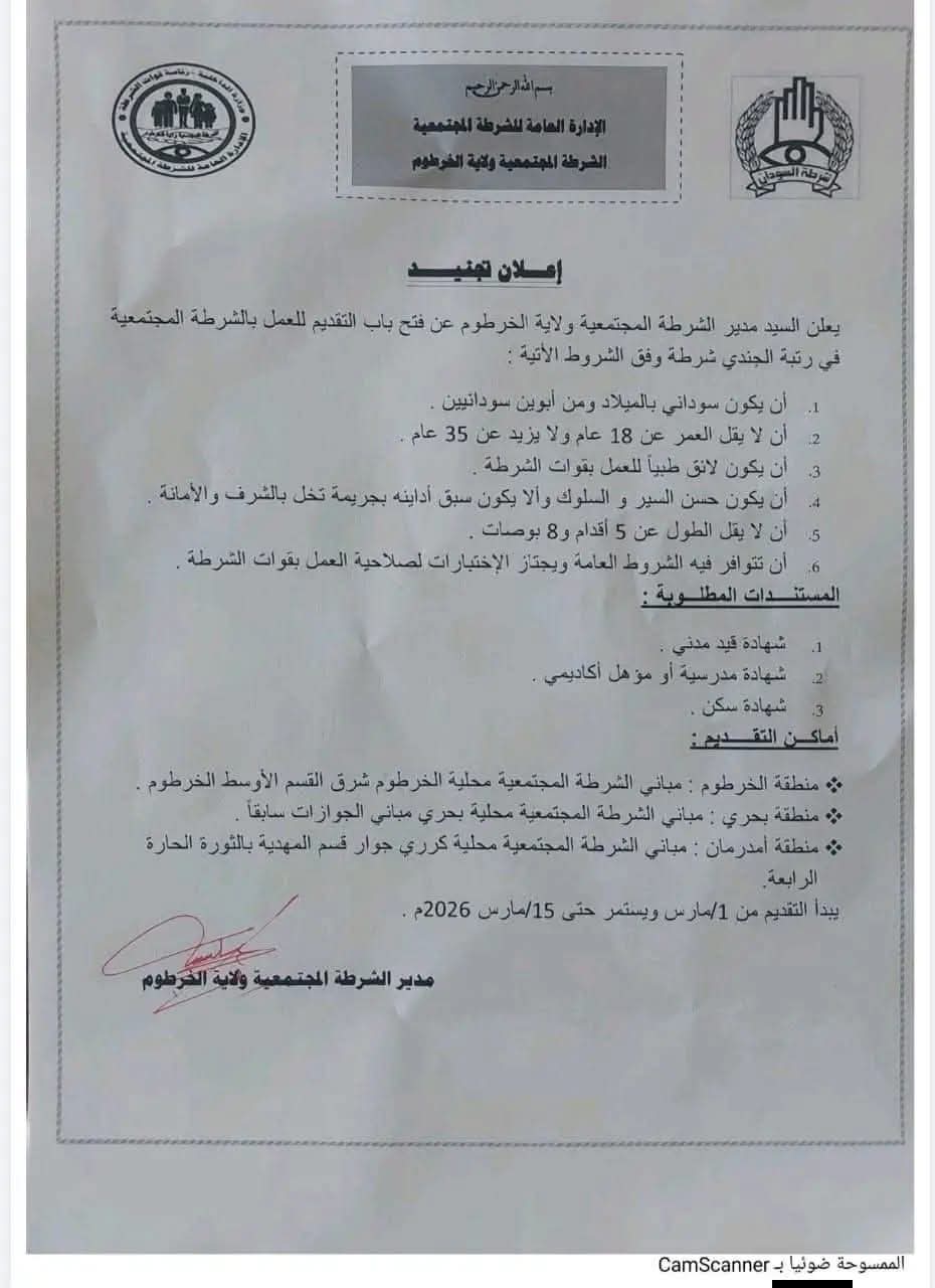 في خطوة تعكس توجهًا متجددًا نحو تعزيز الأمن المجتمعي وبناء جسور الثقة بين المواطن ومؤسسات إنفاذ القانون، أعلنت الإدارة العامة للشرطة المجتمعية بولاية الخرطوم عن فتح باب التقديم للانضمام إلى صفوفها في رتبة “جندي شرطة”. الإعلان يأتي في وقت تتزايد فيه الحاجة إلى كوادر شابة تتحلى بالمسؤولية والانضباط، وقادرة على العمل بروح الفريق لخدمة المجتمع وحماية استقراره.