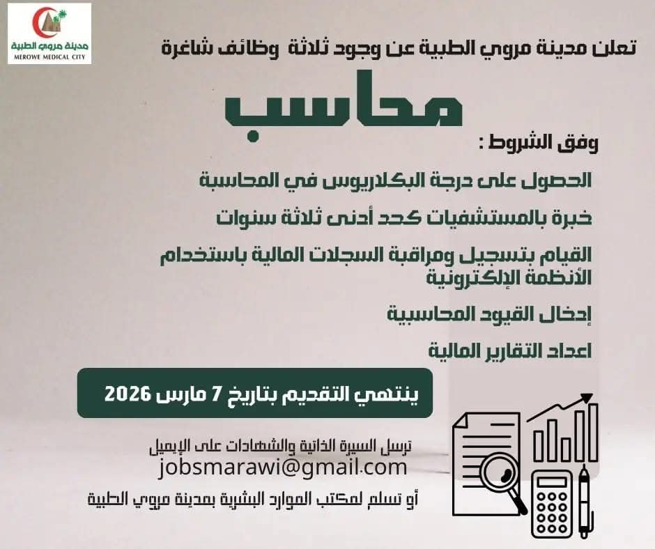 في إطار سعيها لتعزيز كفاءة الأداء المالي وتطوير منظومتها الإدارية، أعلنت مدينة مروي الطبية عن فتح باب التقديم لشغل ثلاث وظائف شاغرة بمسمى (محاسب)، للعمل ضمن فريقها المالي، وذلك لدعم العمليات المحاسبية وضمان دقة السجلات والتقارير المالية داخل المؤسسة الصحية.