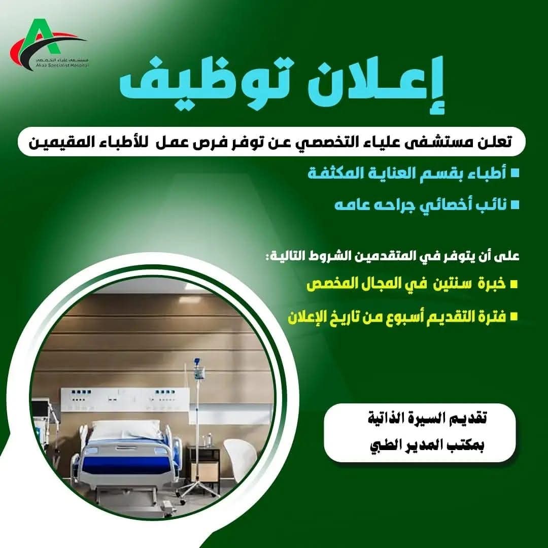 مستشفى علياء التخصصي تعلن عن وظائف أطباء بالعناية المكثفة والجراحة العامة