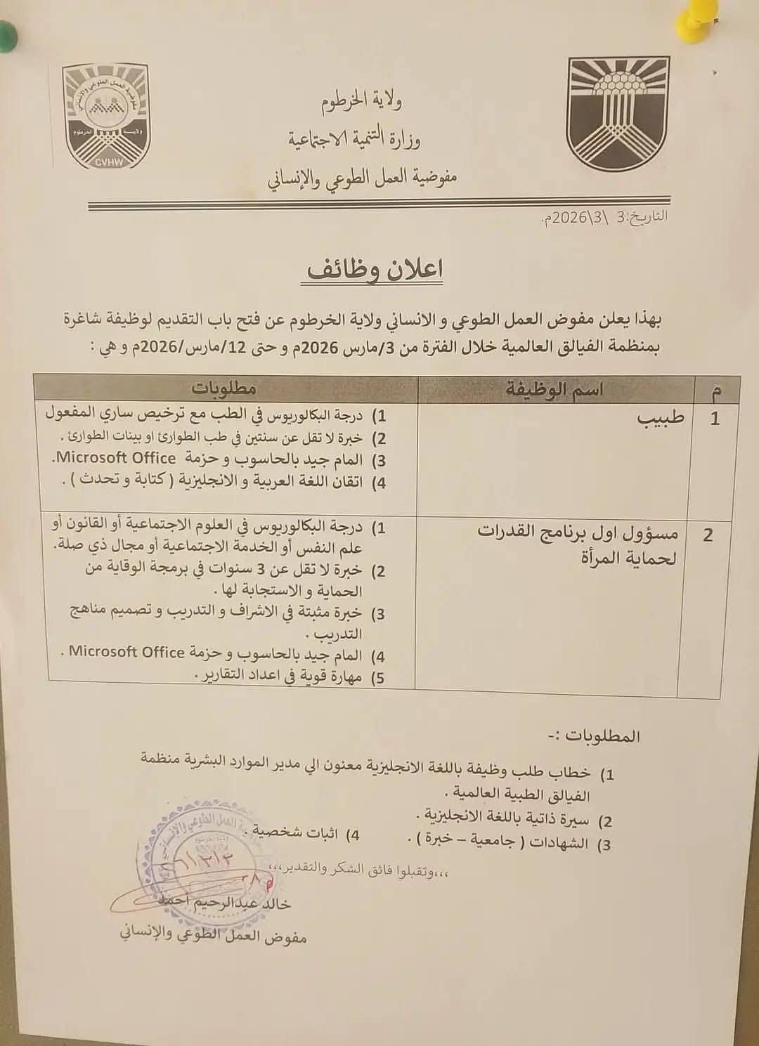 مفوضية العمل الطوعي بولاية الخرطوم تعلن عن وظائف طبية وبرامج حماية