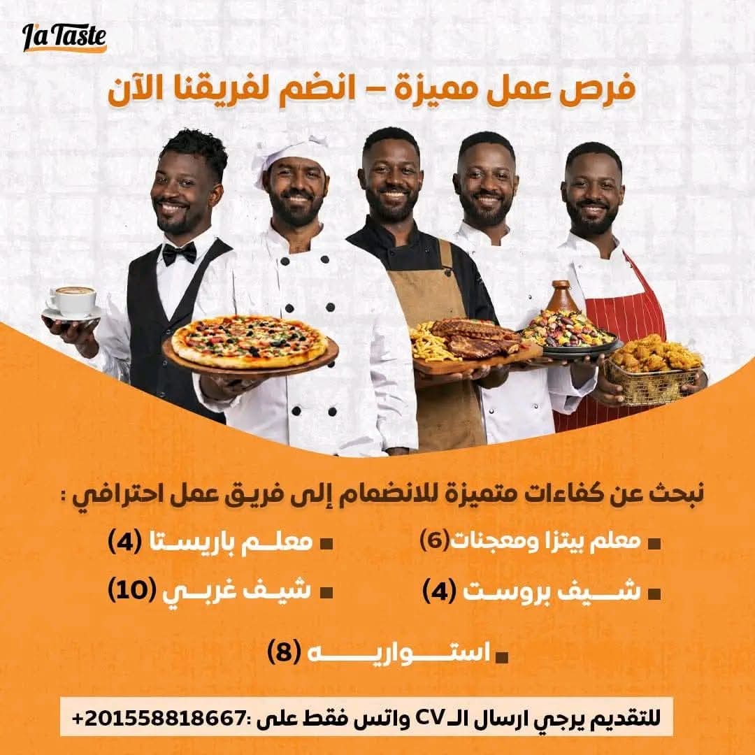 فرص مهنية في الطهي وخدمة الضيافة تشمل شيفات، باريستا، ومعلمي بيتزا وبروست بشروط خبرة والتزام