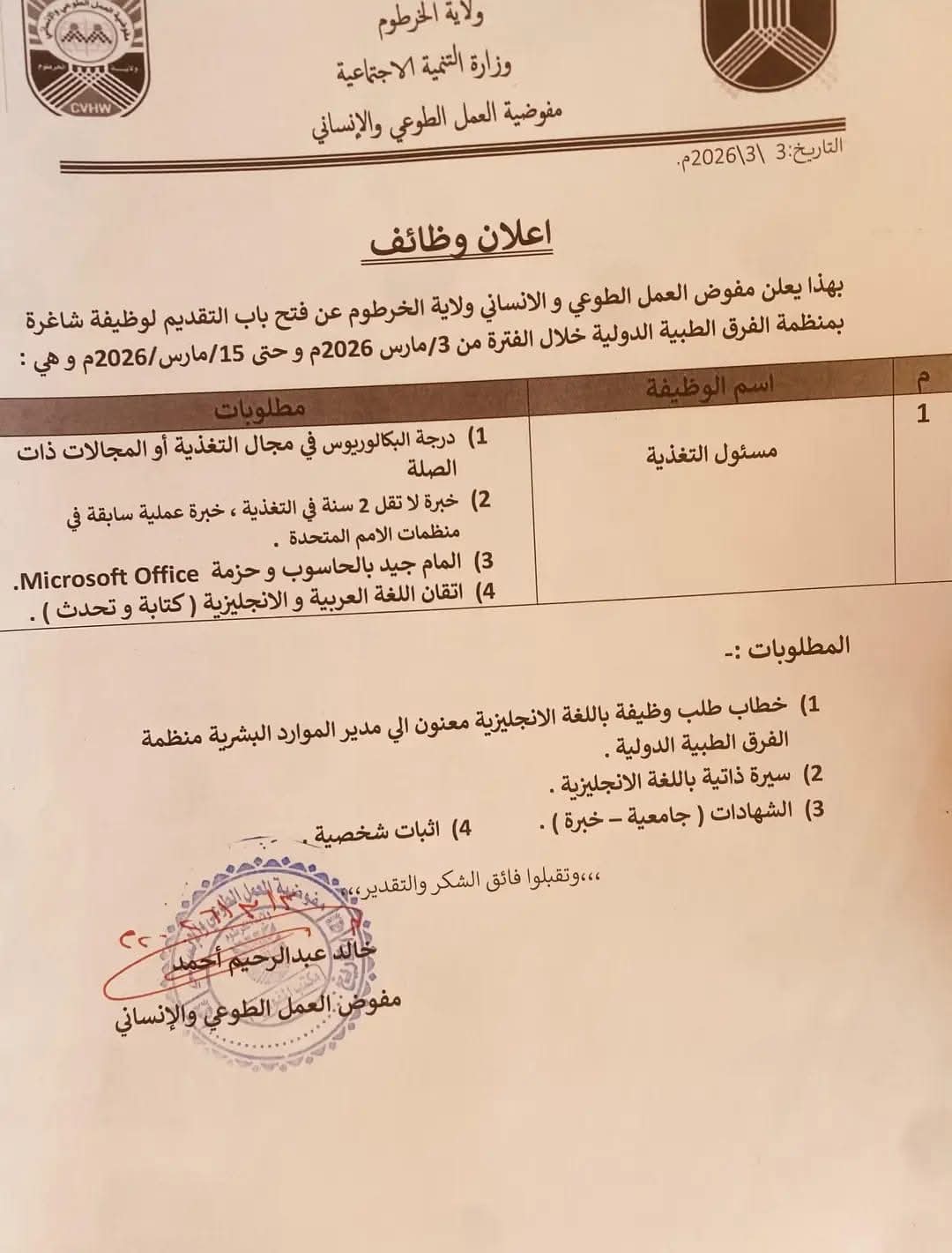 في إطار الجهود الرامية لتعزيز الاستجابة الإنسانية ودعم القطاع الصحي، أعلنت مفوضية العمل الطوعي والإنساني بولاية الخرطوم عن فتح باب التقديم لشغل وظيفة ضمن أنشطة منظمة الفرق الطبية الدولية، وذلك خلال الفترة من 3 مارس 2026 وحتى 15 مارس 2026.