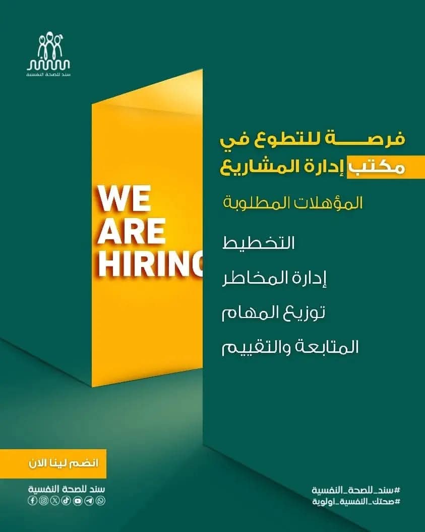 فتح باب التطوع في مكتب إدارة المشاريع بمبادرة سند للصحة النفسية