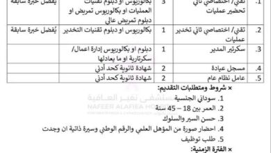 طريقة التقديم: مكان العمل في مدينة بورتسودان. يمكن للراغبين في التقديم إرسال السيرة الذاتية عبر البريد الإلكتروني التالي: Cbeautyhr@gmail.com أو التواصل عبر الرقم 0120025310 أو عبر واتساب من خلال الرابط التالي: https://wa.me/249120025310.