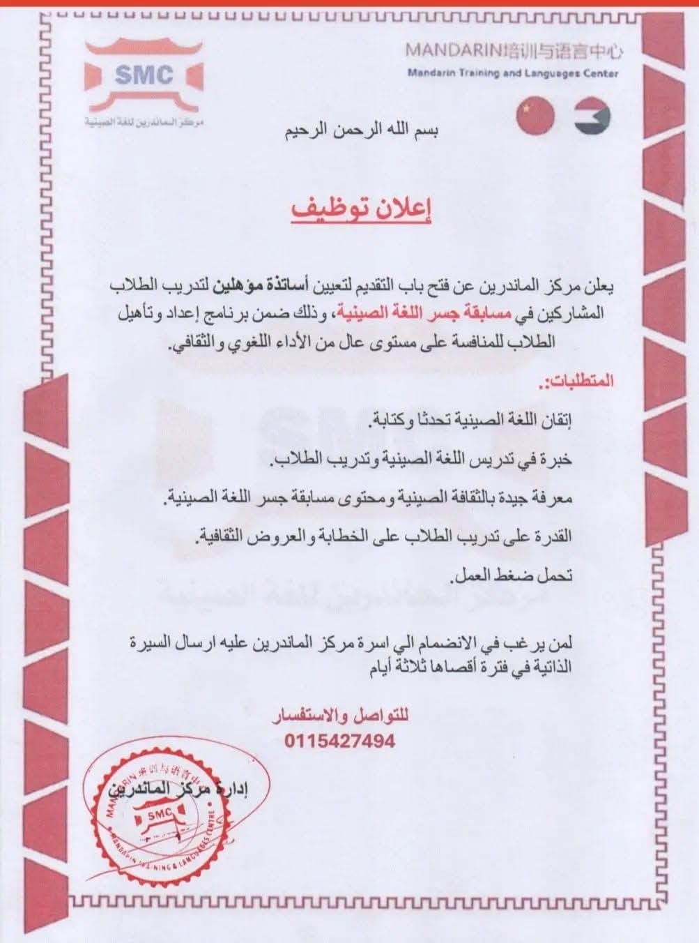 مركز الماندرين يعلن وظيفة أساتذة لتدريب الطلاب في مسابقة جسر اللغة الصينية