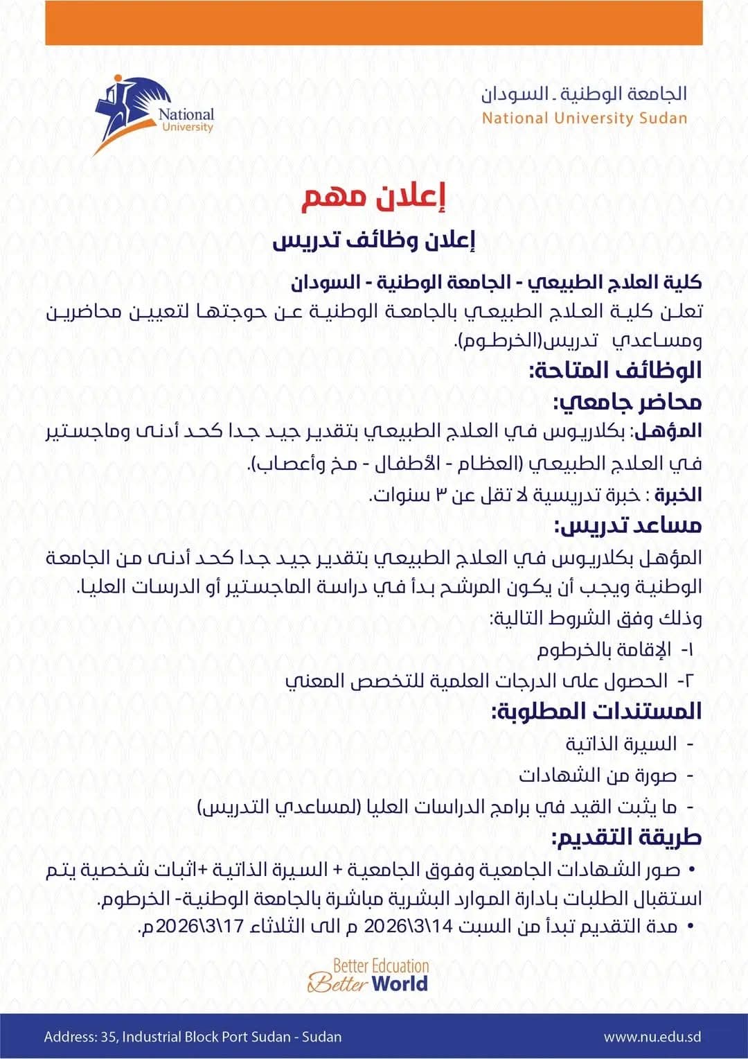الجامعة الوطنية تعلن وظائف محاضرين ومساعدي تدريس بكلية العلاج الطبيعي في الخرطوم