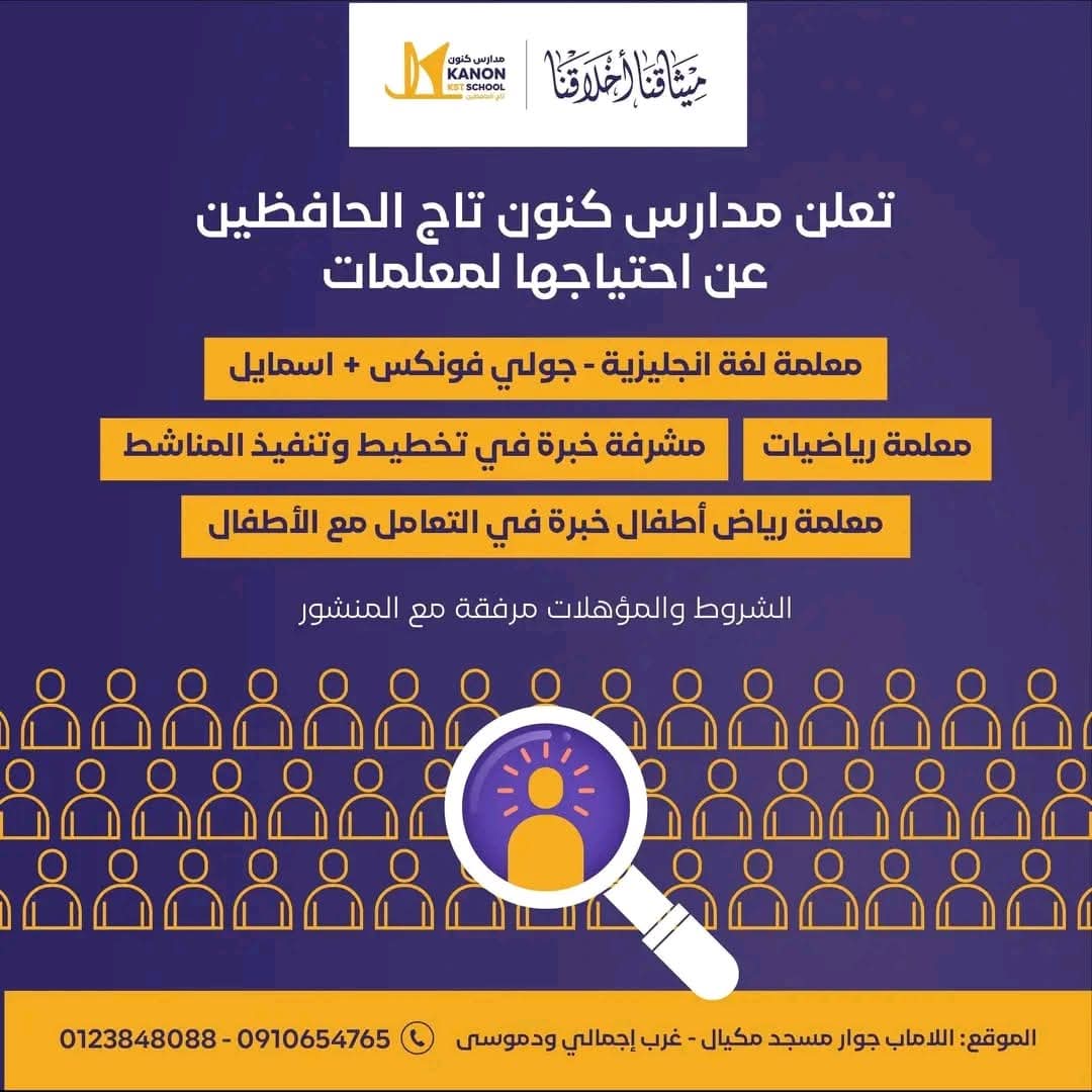 في إطار سعيها المستمر للارتقاء بالعملية التعليمية وتطوير بيئة تعليمية متكاملة، أعلنت مدارس كنون تاج الحافظين عن فتح باب التقديم لعدد من الوظائف التعليمية والإشرافية، وذلك لاستقطاب كوادر مؤهلة تسهم في بناء جيل متميز يمتلك المهارات والمعرفة اللازمة لمواكبة متطلبات العصر.