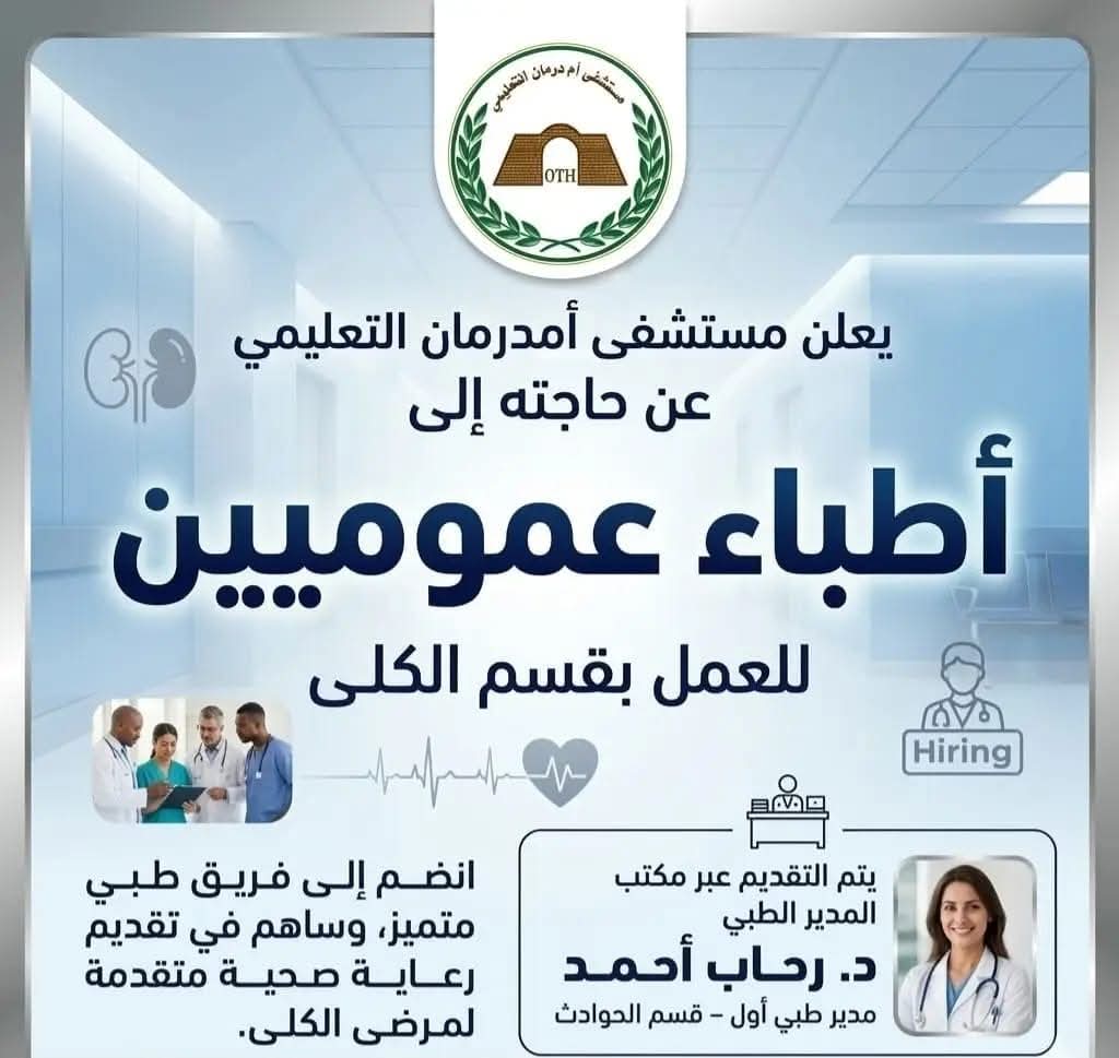 للتقديم على الوظيفة، يرجى التوجه إلى مكتب المدير الطبي بمستشفى أم درمان التعليمي والتقديم مباشرة عبر د. رحاب أحمد.