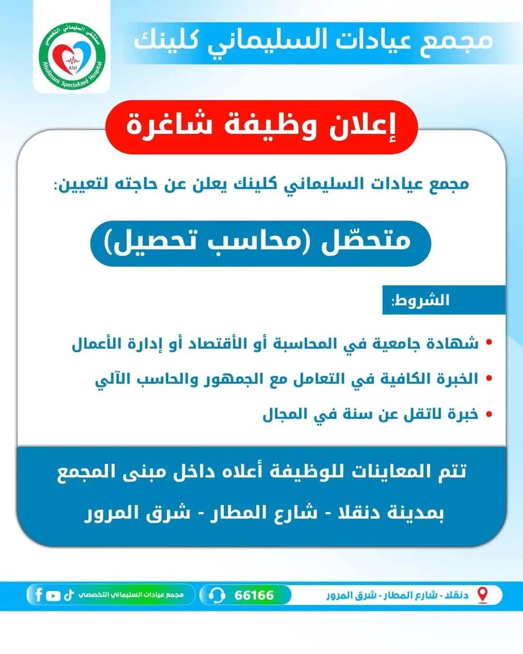 مجمع السليماني كلينك يعلن عن وظيفة متحصّل (محاسب تحصيل) بدنقلا