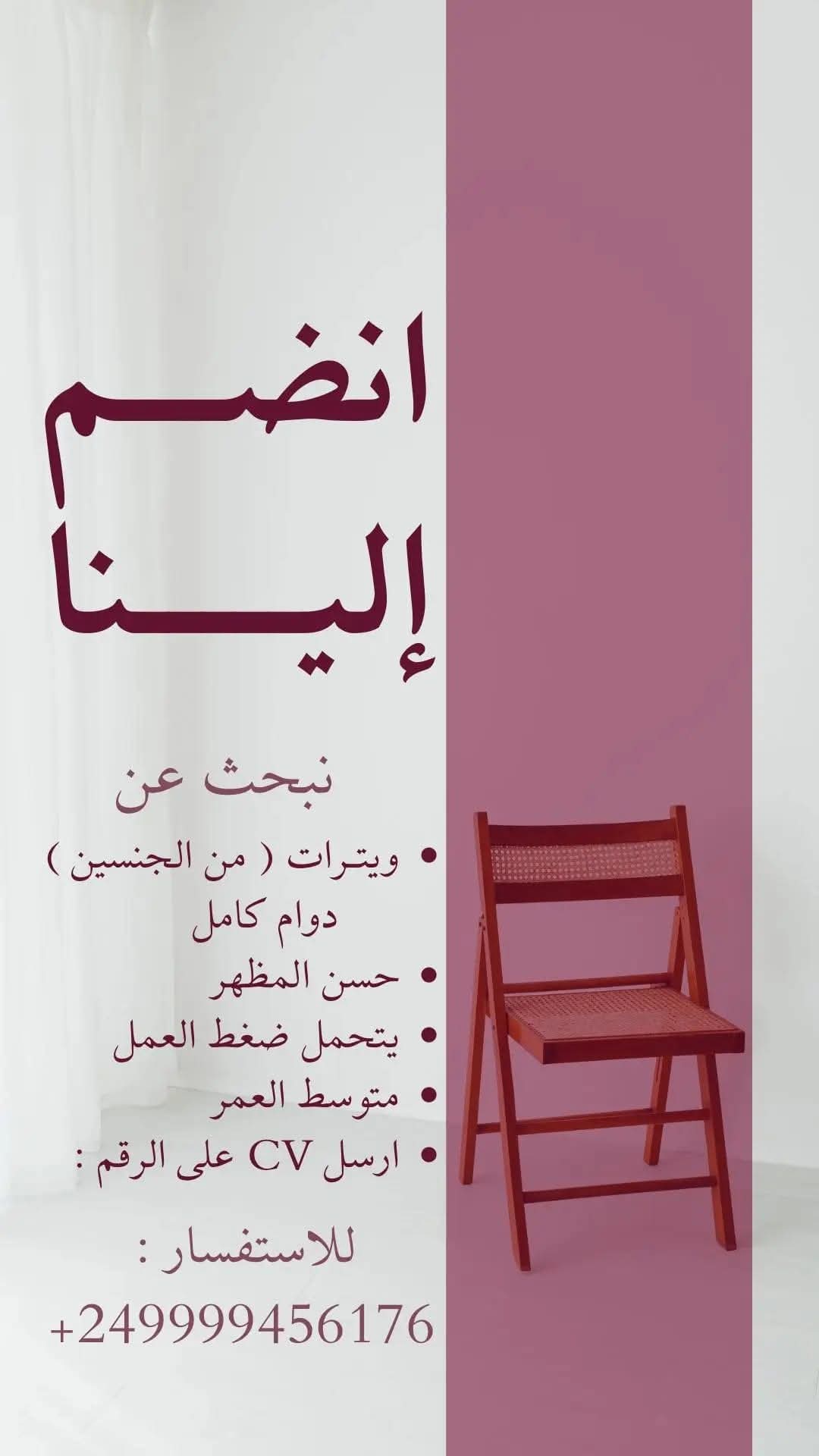 للتقديم، يرجى إرسال السيرة الذاتية عبر الرقم التالي: +249999456176