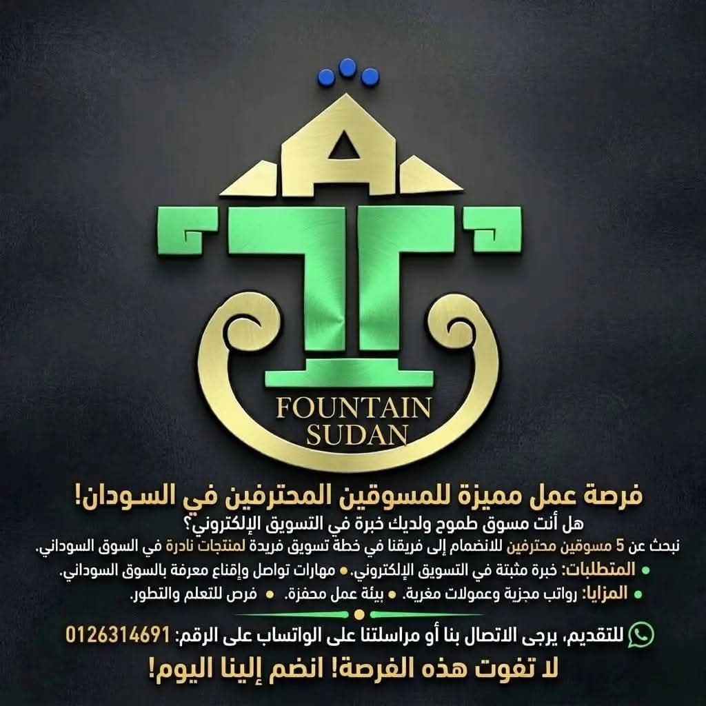 في ظل التحديات الاقتصادية التي يشهدها السودان، تظل فرص العمل في مجال التسويق الإلكتروني من بين أبرز المسارات التي تفتح آفاقًا جديدة أمام الشباب الطموح، خاصة مع التوسع المستمر في التجارة الرقمية واعتماد الشركات على الحلول التسويقية الحديثة للوصول إلى عملائها. وفي هذا الإطار، أعلنت شركة النافورة السودانية عن فرصة عمل مميزة تستهدف المسوقين المحترفين الراغبين في خوض تجربة مهنية مختلفة ضمن فريق يعمل على خطة تسويق مبتكرة لمنتجات نادرة في السوق المحلي.