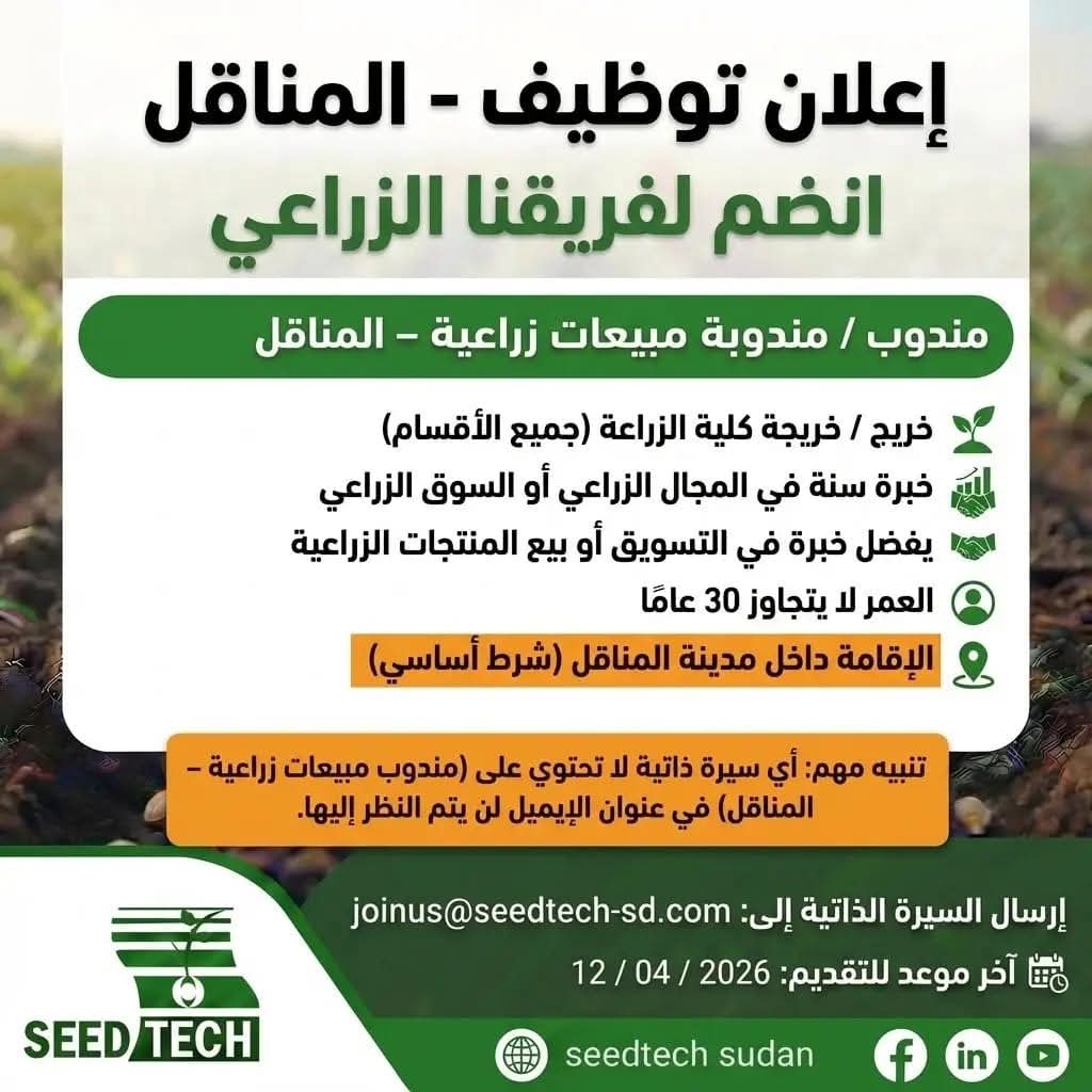 للتقديم، يرجى إرسال السيرة الذاتية إلى البريد الإلكتروني التالي: joinus@seedtech-sd.com، مع ضرورة كتابة (مندوب مبيعات زراعية – المناقل) في عنوان الإيميل، وذلك قبل تاريخ 12 أبريل 2026.