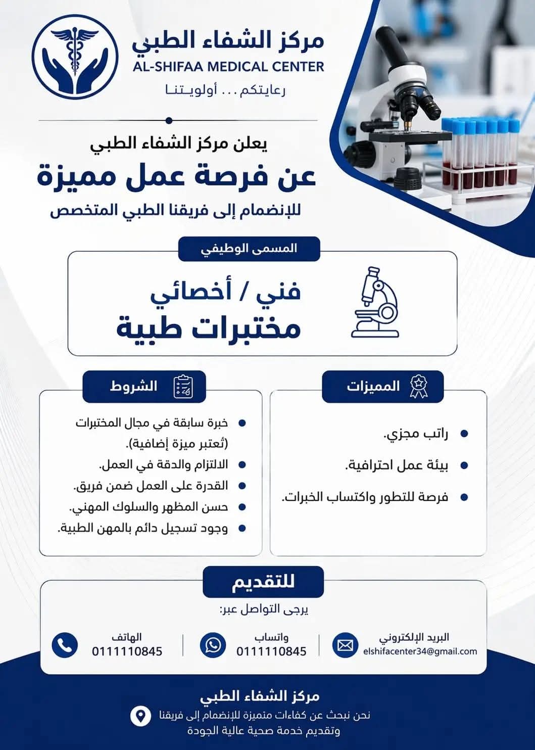 في ظل التوسع المستمر في القطاع الصحي وارتفاع الحاجة إلى كوادر مؤهلة، أعلن مركز الشفاء الطبي عن توفر فرصة عمل مميزة في مجال المختبرات الطبية، وذلك ضمن جهوده لتعزيز جودة الخدمات التشخيصية وتقديم رعاية صحية دقيقة وآمنة للمرضى.