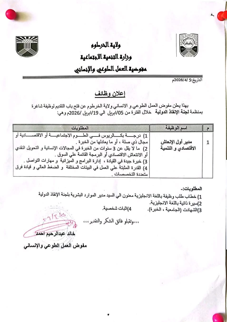 للتقديم، يرجى التوجه إلى مباني مفوضية العمل الطوعي والإنساني بولاية الخرطوم، شرق المدينة الرياضية وجنوب جامعة أفريقيا العالمية، وذلك خلال الفترة من 5 أبريل حتى 19 أبريل.