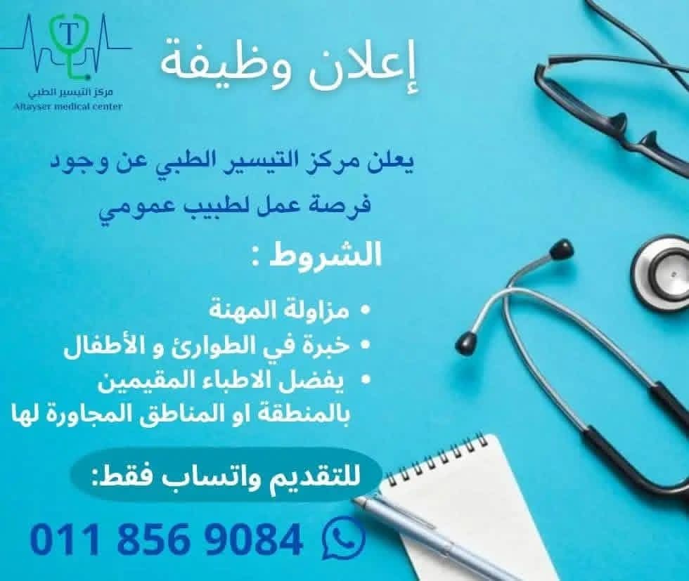 يعلن مركز التيسير الطبي (Altayser Medical Center) عن فتح باب التقديم لعدد من الفرص الوظيفية في مجالات طبية مختلفة، وذلك في إطار سعي المركز إلى تعزيز كادره الصحي وتقديم خدمات طبية أكثر كفاءة وجودة للمرضى، بما يواكب احتياجات المجتمع المحلي ويعزز من استمرارية الرعاية الصحية داخل المنطقة.