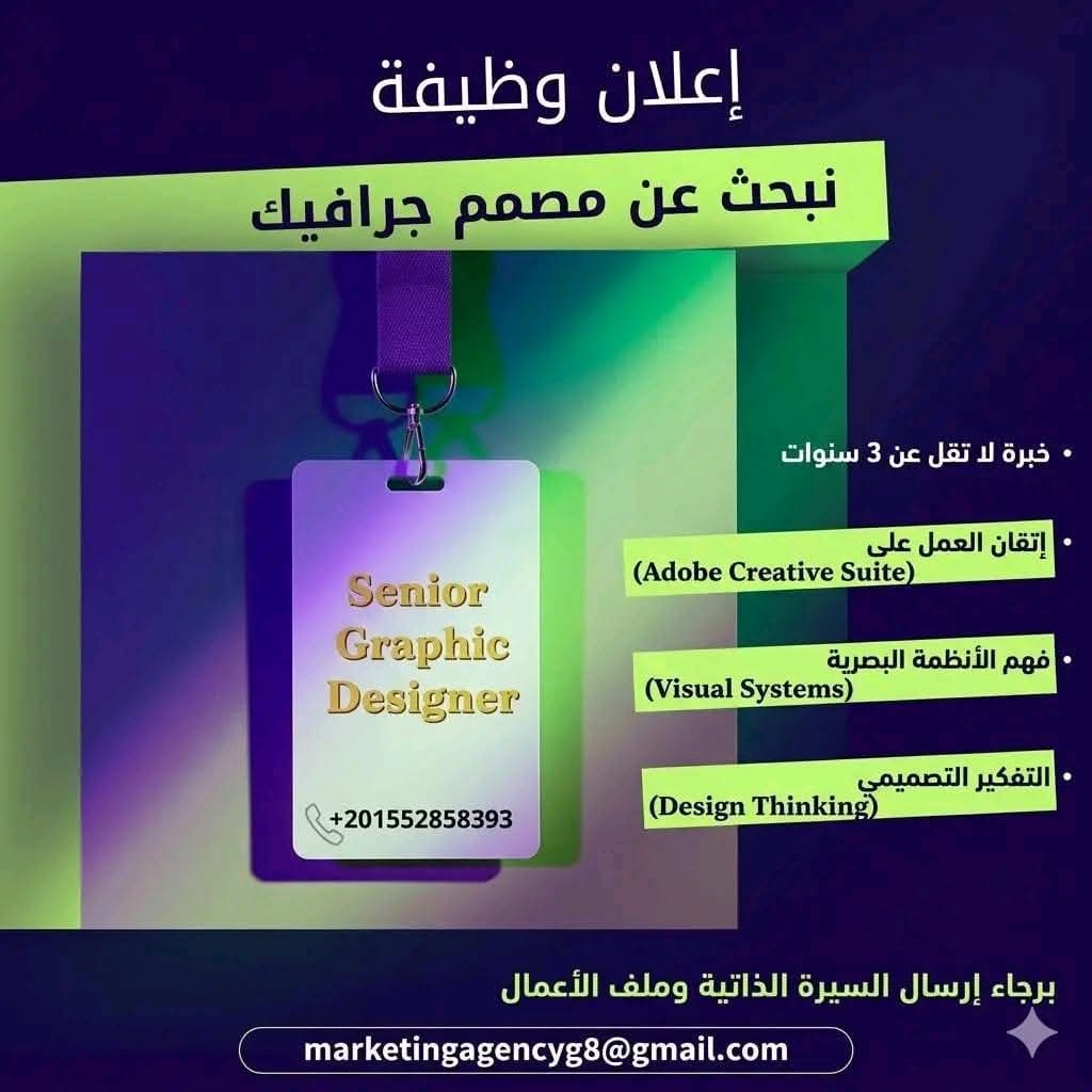 يرجى إرسال السيرة الذاتية مرفقة بنماذج الأعمال (Portfolio) عبر البريد الإلكتروني: marketingagencyg8@gmail.com